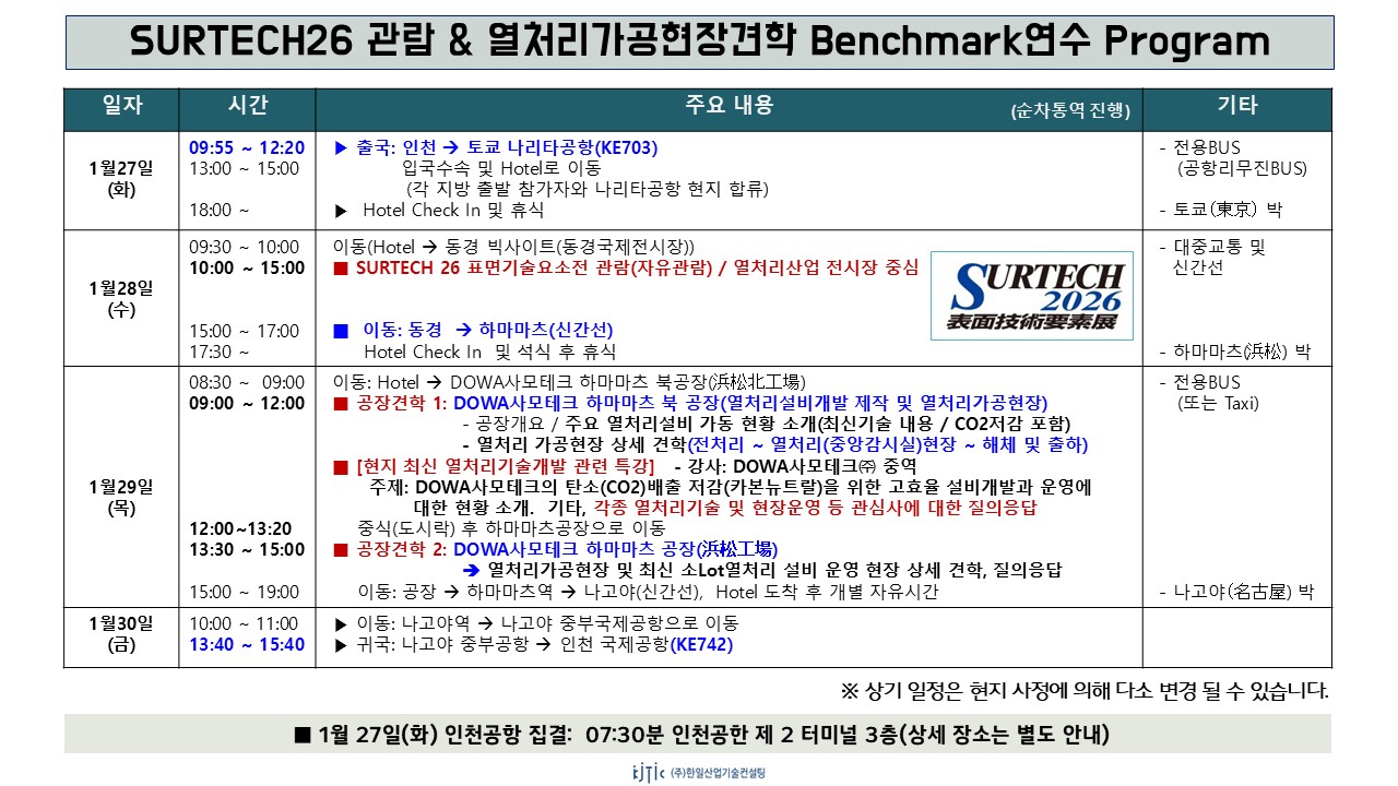2026년 1월 제 2차 일본 열처리가공현장견학 연수_2026년 1월 27일(화)~30일(금)